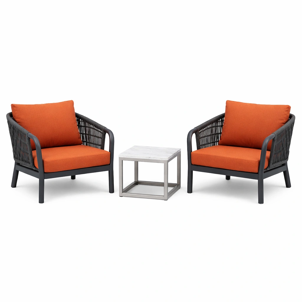Material: Rahmen aus Aluminium, Tischplatte aus weißem Marmor, Sitz- und Rückenkissen aus Polyethylengeflecht mit Schaumstofffüllung