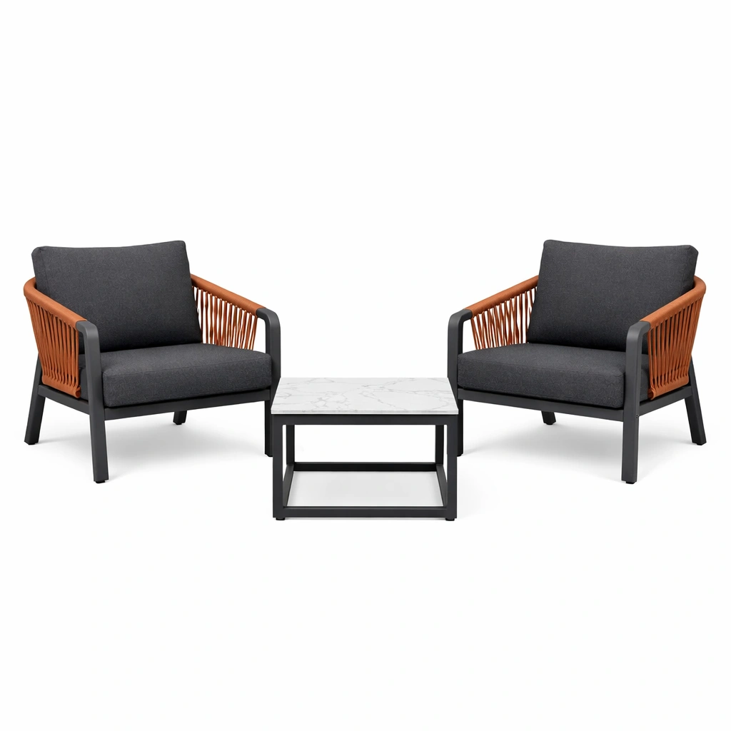 Material: Rahmen aus Aluminium, Armlehnen umwickelt mit Stahlseil und Polyester, Tischplatte aus Keramik