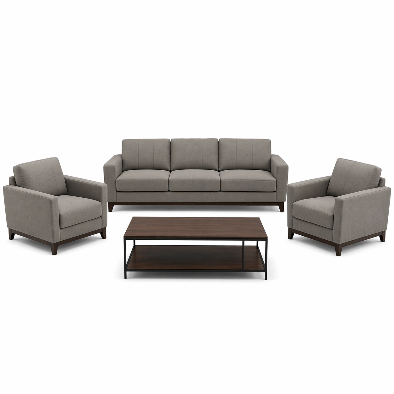 Produktliste: Enthält ein 3-Sitzer-Sofa, zwei Sessel und einen Couchtisch.